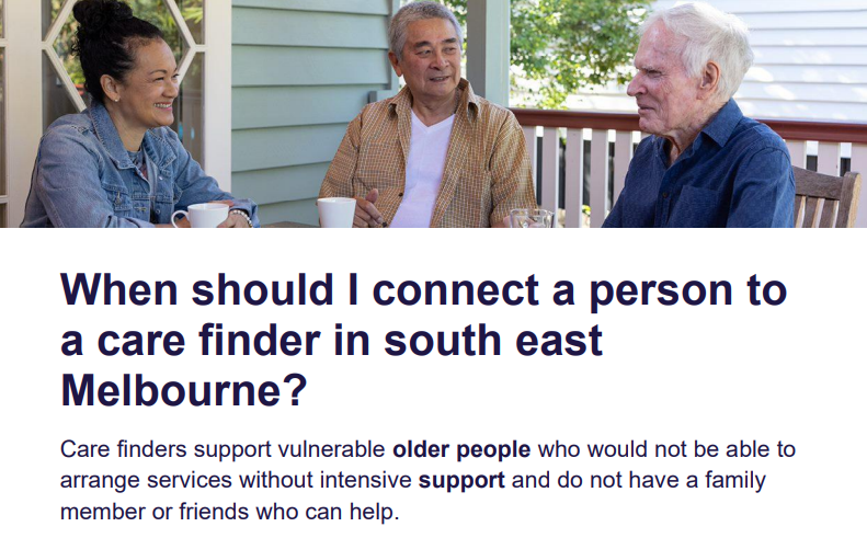 1 January 2026 to 31 March 2026, some care finder service providers in south east Melbourne will be changing. General guidance on service delivery is included below but may not reflect an individual provider’s current status.